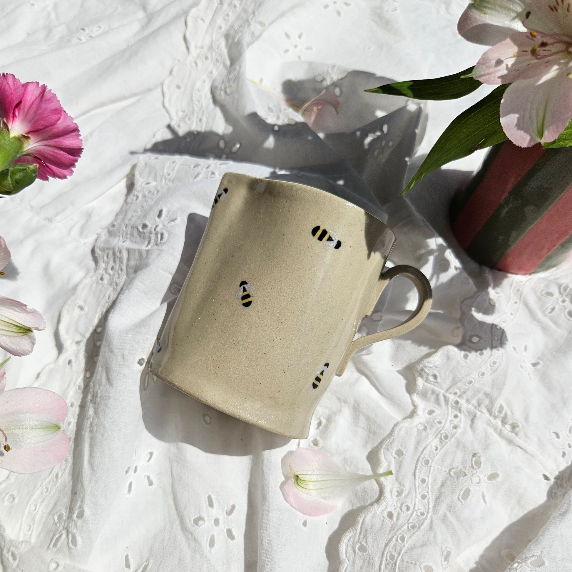 Die Kanne aus der Biene-Kollektion ist für Heiß- und Kaltgetränke geeignet. Außerdem sind alle Kannen auch als Vase nutzbar. (Sommertipp: Kalte Milch zum Kaffee oder ein Kaltgetränk mit Eiswürfeln hält in der Keramikkanne deutlich länger der Außentemperatur stand, als ein Gefäß aus Glas.)