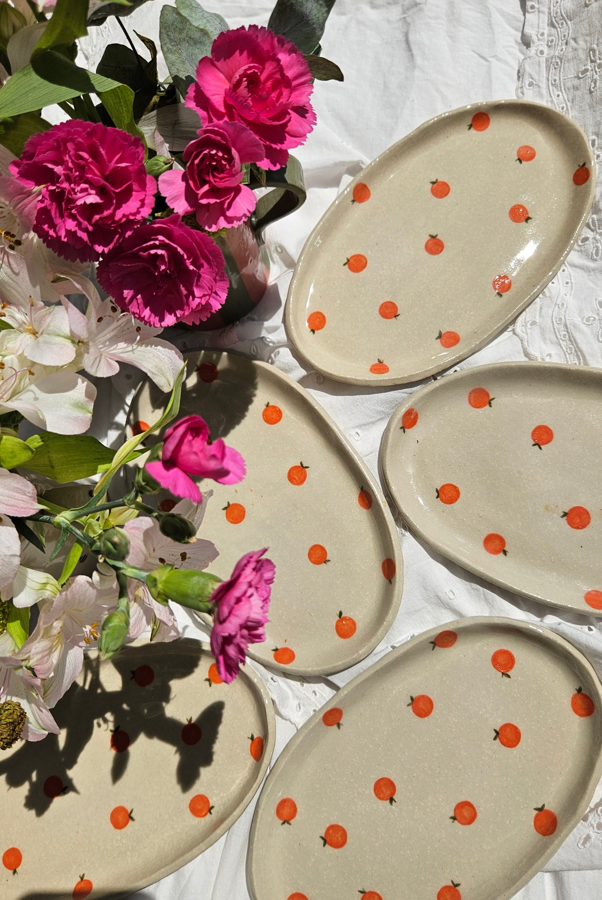 Die Platte aus der Pippa Kollektion ist ein Allrounder mit kleinen, handbemalten Orangen. Am besten ist sie geeignet zum Servieren von Fingerfood, Obst, Keksen und anderen Kleinigkeiten auf dem Esstisch.