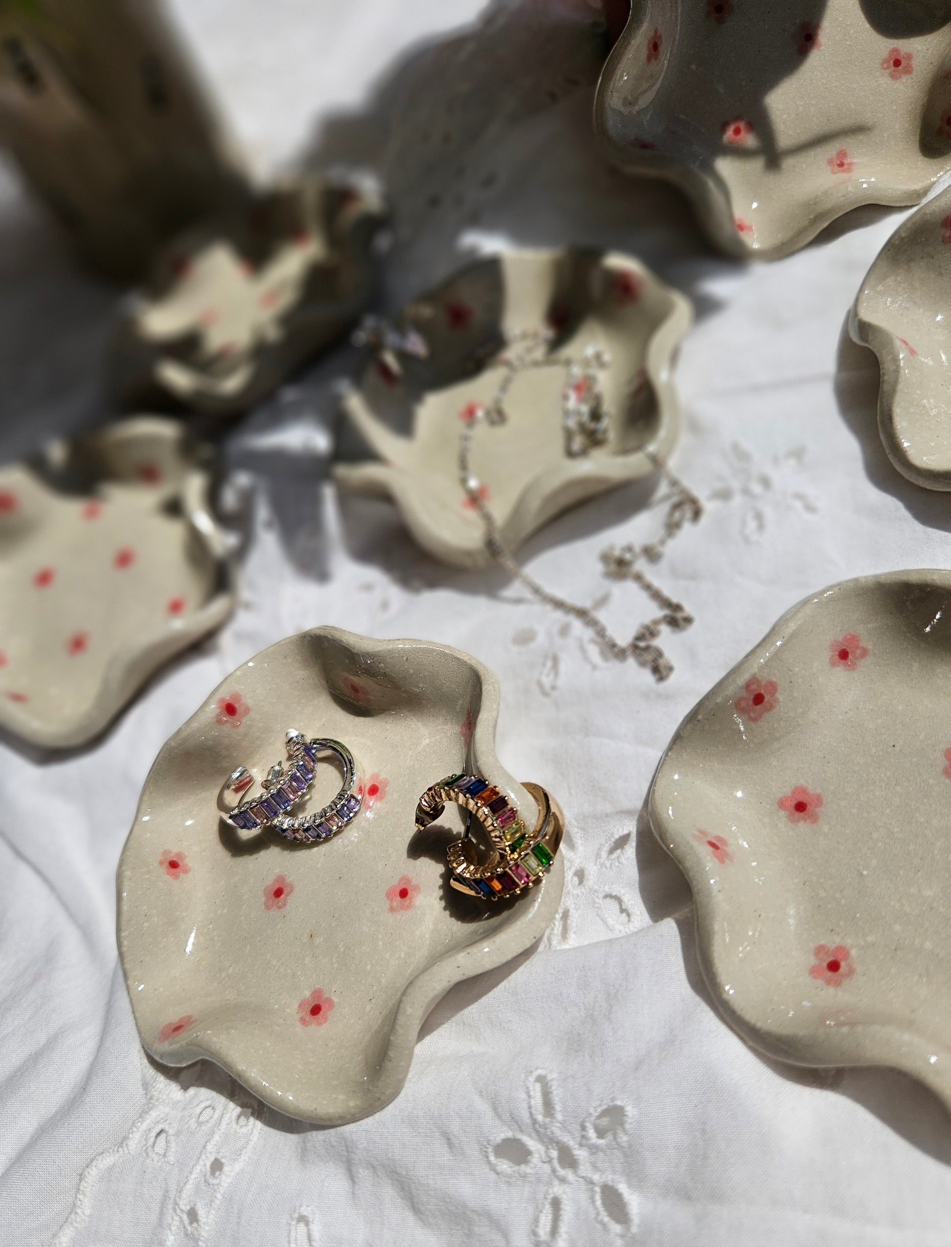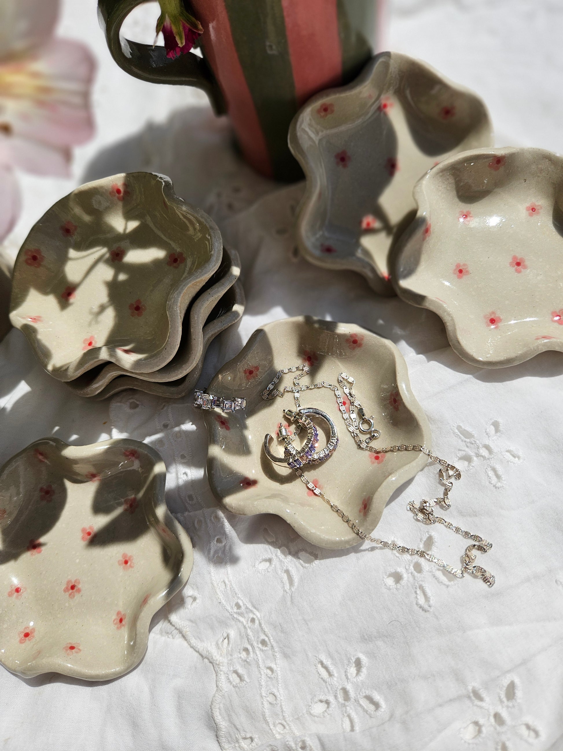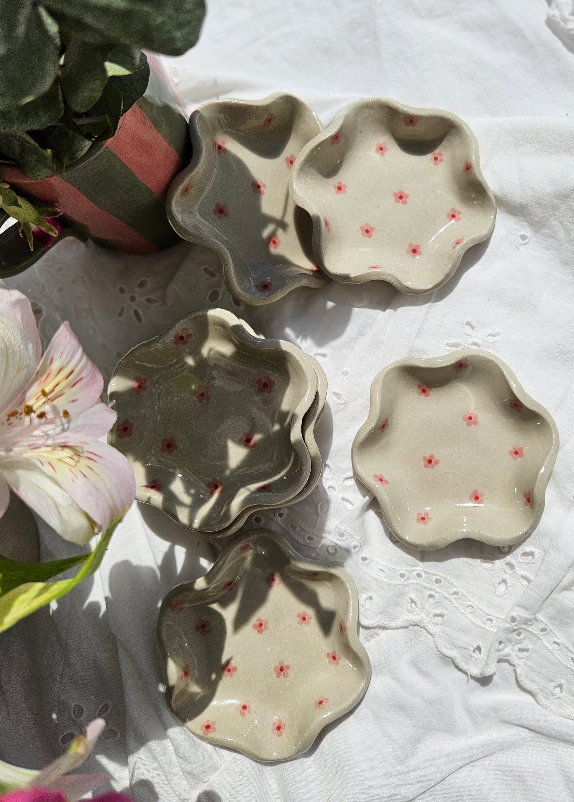 Kleine Schale mit Rüschenrand und handbemalten Blumen in rosa-rot.