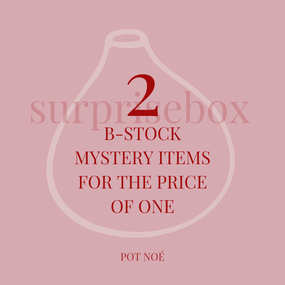 Die surprisebox beinhaltet 2 (zwei) B-Ware Stücke. Diese werden zufällig ausgewählt und der Preis ist zu mehr als 50% reduziert. B-Ware bedeutet, dass die Artikel kleine Mängel aufweisen, wie zB. leichte Farbveränderungen oder optische Microrisse. KEINE undichten Stellen, Bruchstellen oder andere Mängel die den Artikel unbrauchbar machen. Alle Produkte sind lebensmittelecht und spülmaschinenfest.